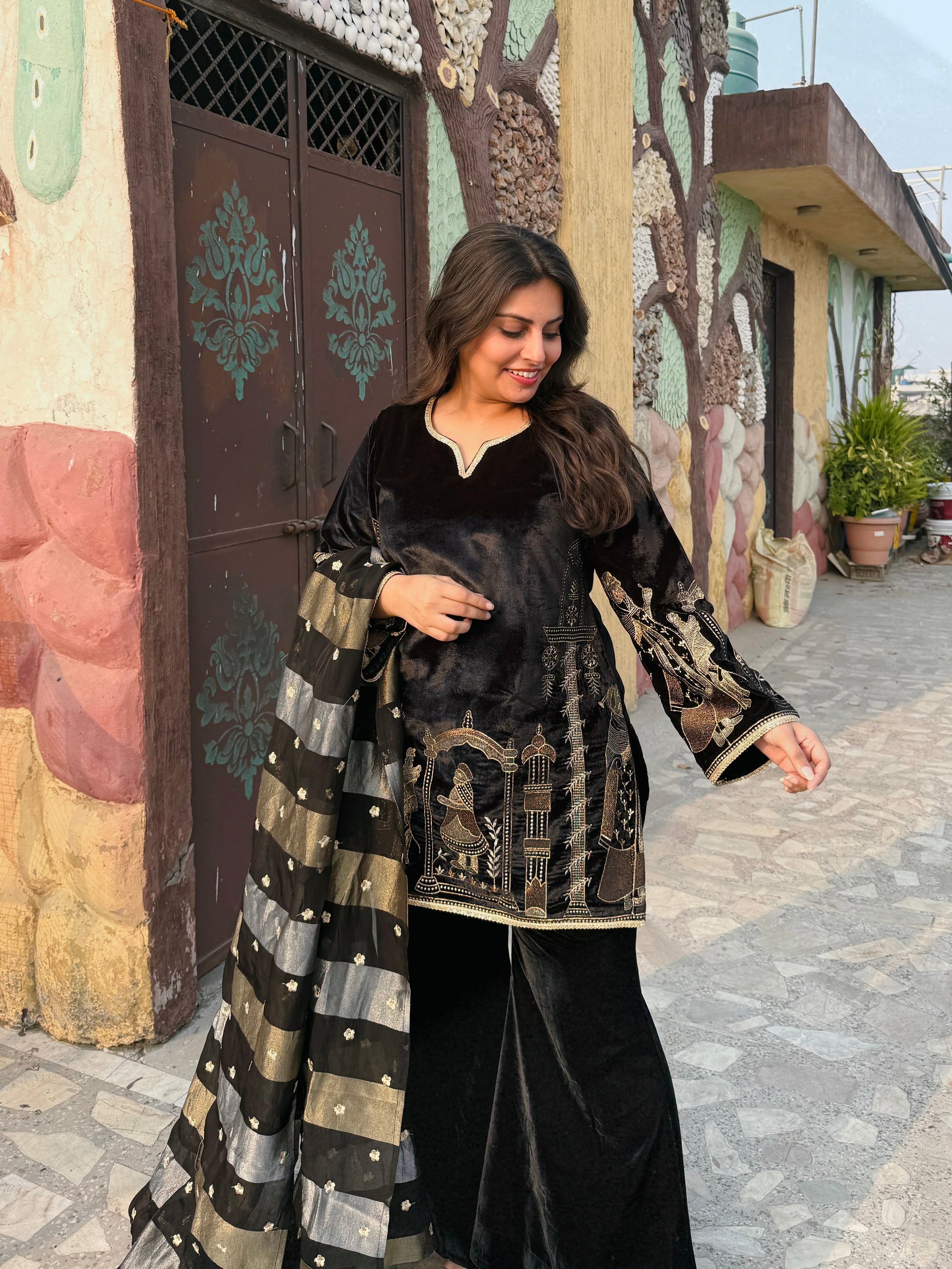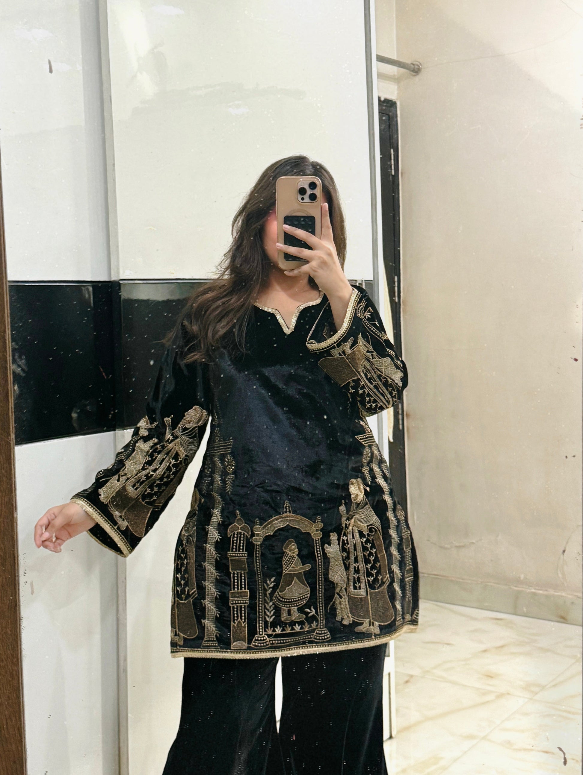 • Tunic: Mid-length straight-cut kurta with intricate metallic embroidery on the hem and cuffs.