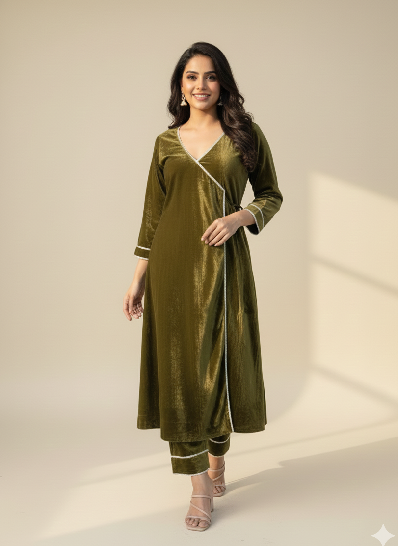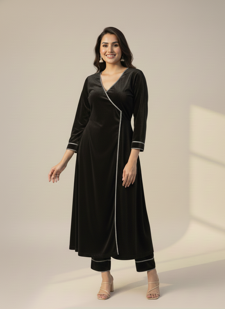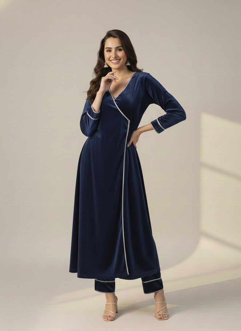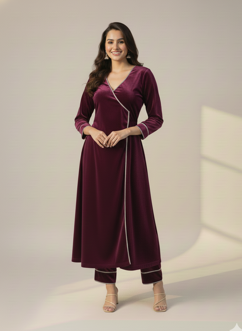Indulge in the rich texture of our premium velvet set. This two-piece ensemble features a sophisticated Angrakha-style wrap kurta with a flattering silhouette, accented by delicate silver piping. Paired with matching straight-cut pants, it offers a seamless blend of traditional charm and modern luxury.